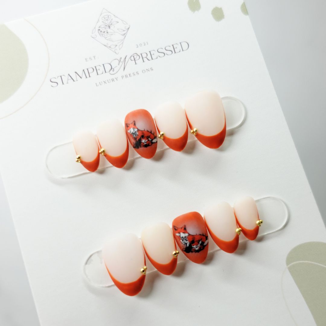 Introducing Autumn Aura, the nail set that will take your fall look to the next level. With a gorgeous terracotta color and unique designs including a fox, french tips, and caviar beads, this nail is sure to make a statement. Add some autumn vibes to your nails with Autumn Aura.