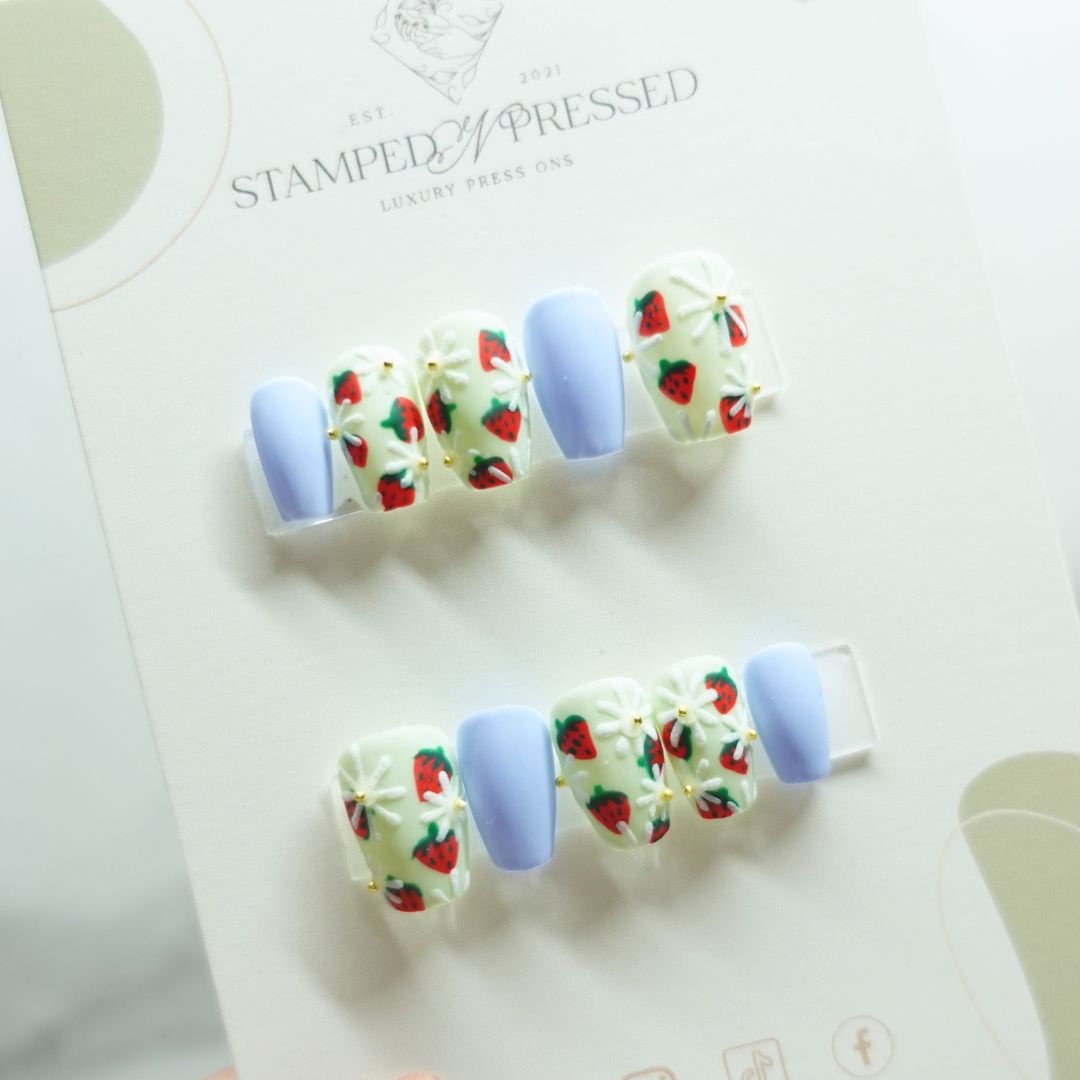Enhance your natural beauty with our Berry Bliss nail set. Featuring a refreshing mint and blue color palette with delicate strawberries and flowers, this set will elevate your everyday look to a whole new level. Perfect for any occasion, show off your unique style and confidence with Berry Bliss.