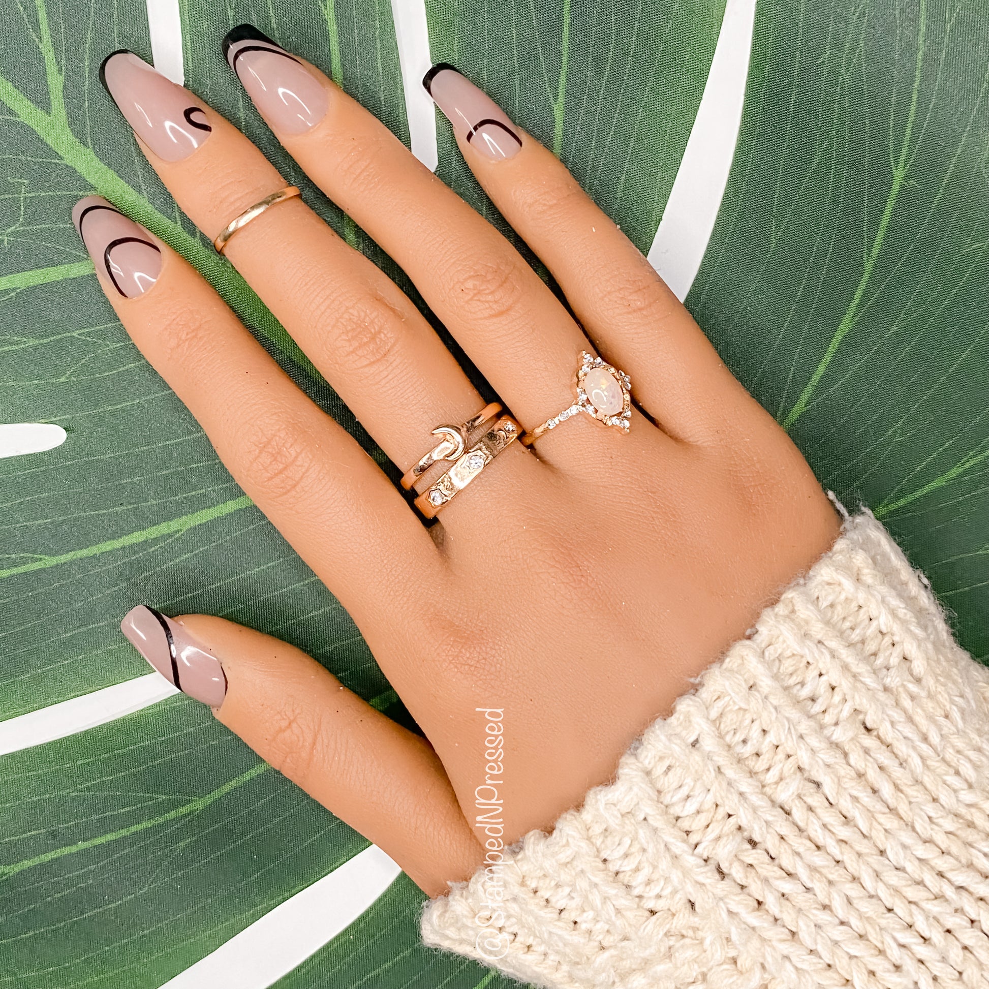 Abstract nail art with black line work with a base shade.