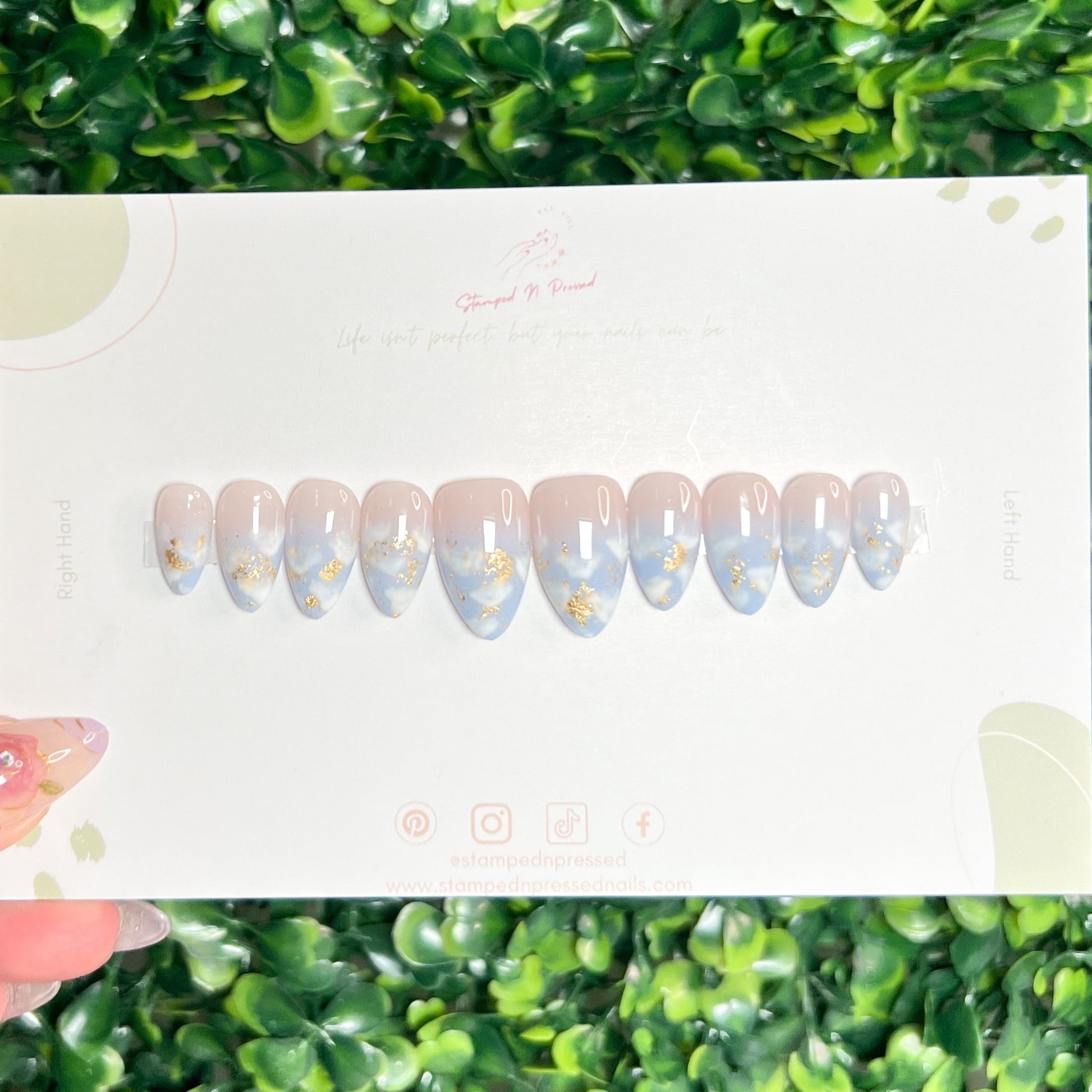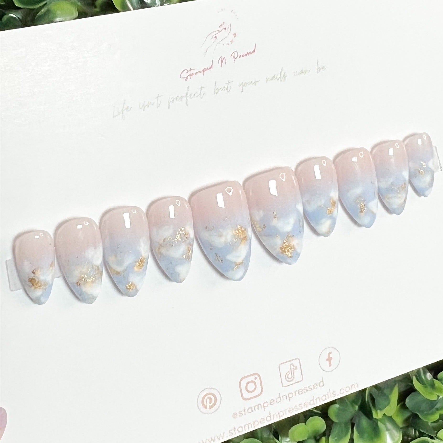 The Cloud 9 nail set is perfect for a statement of style. Its beautiful blue ombre and luxurious gold flakes and clouds offer a touch of sophistication.