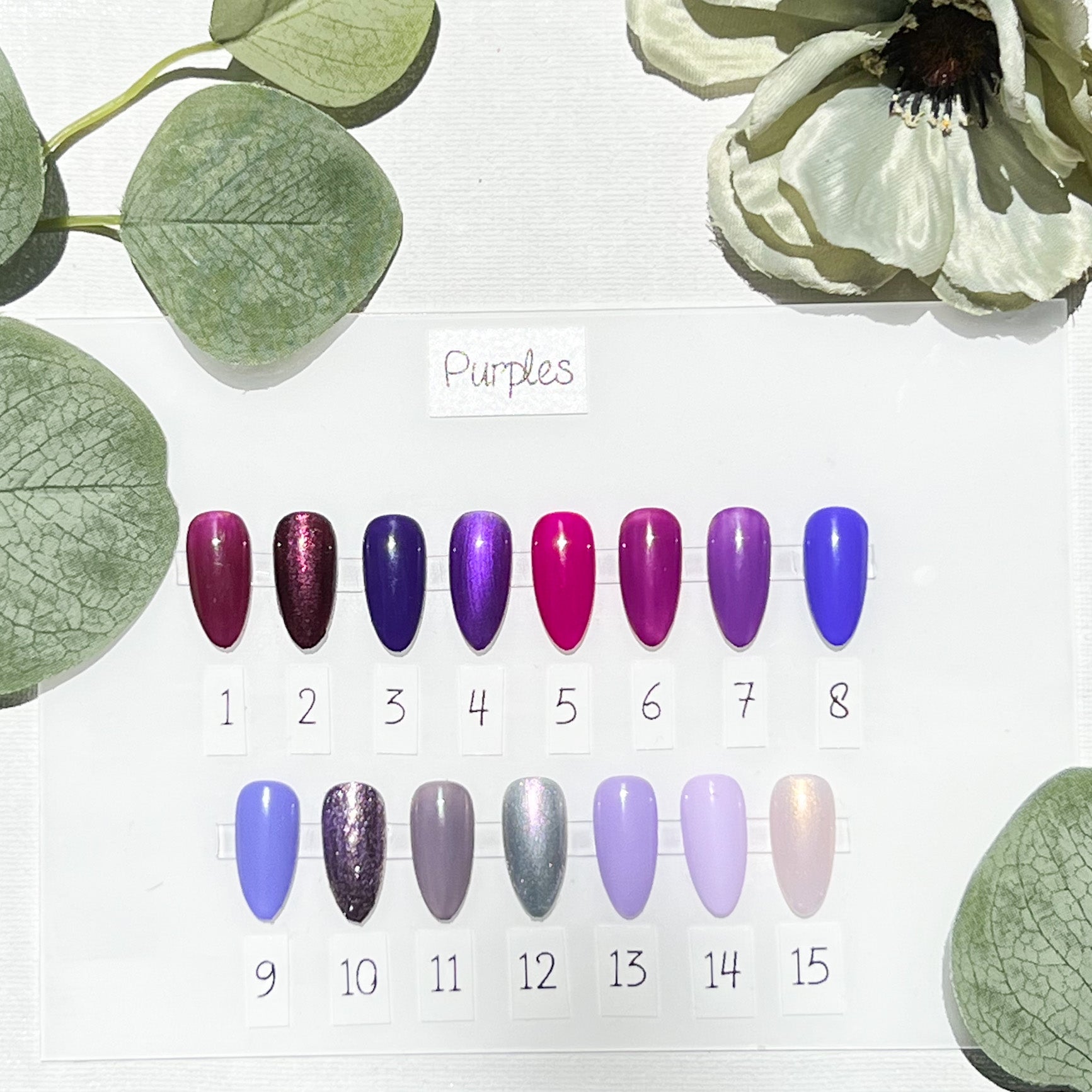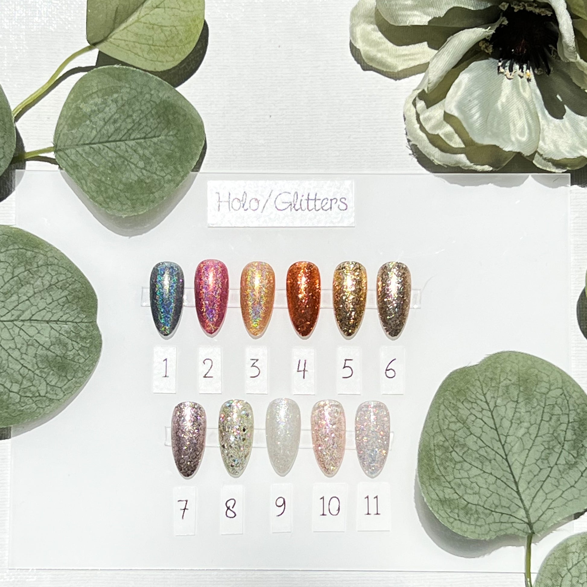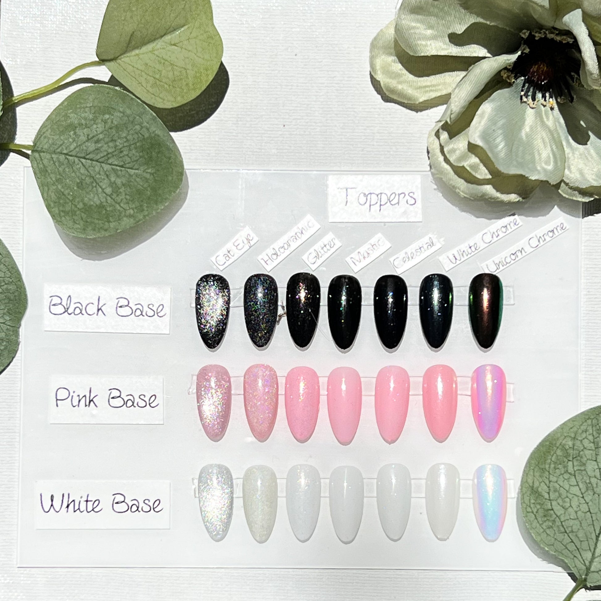 Solid colors include: chrome, glitter topper, cat eyes, holographic toppers.