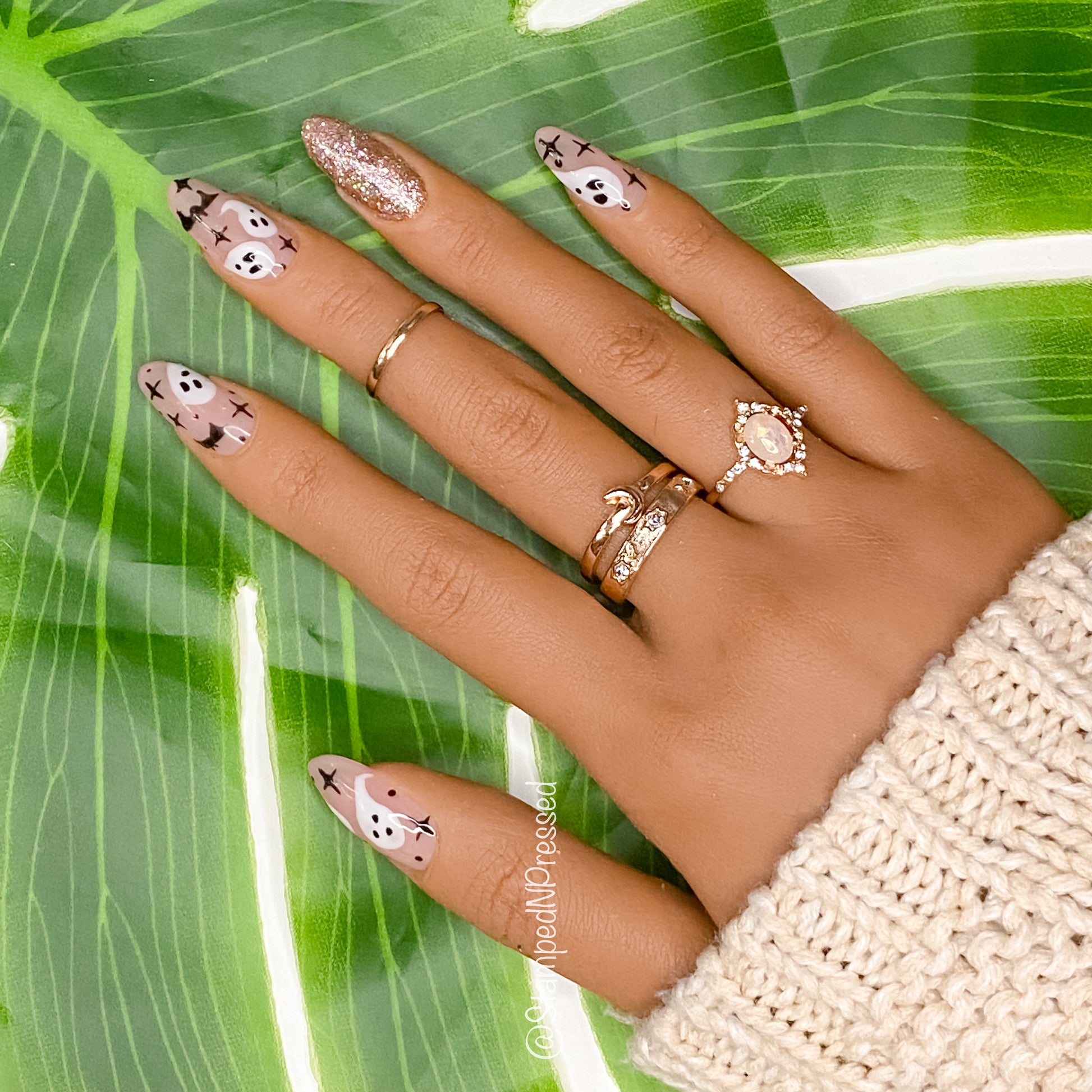 Nude nails with white ghosts, stars, and bats and a pink glitter nail.