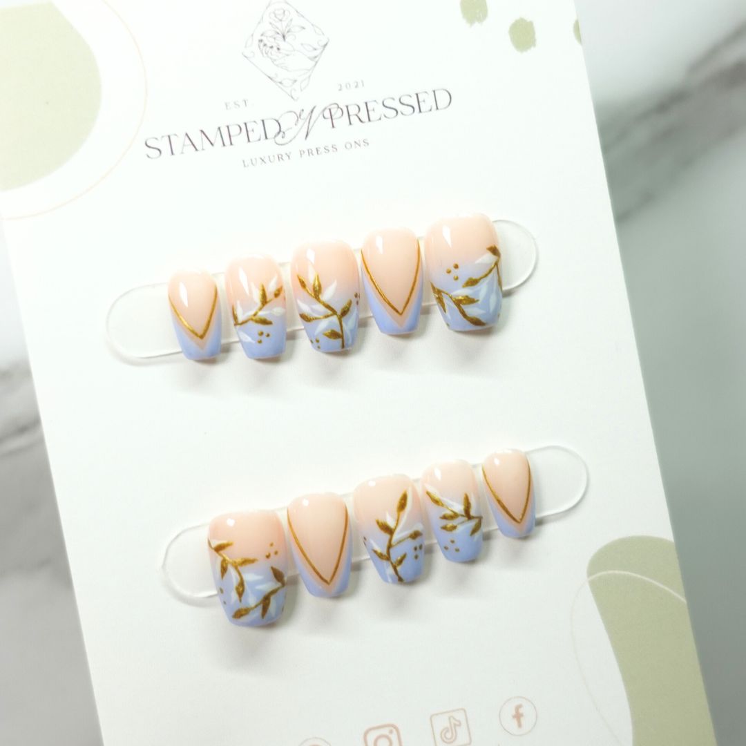 Introducing the Golden Breeze nail set, featuring elegant blue nails with delicate gold and white leaf accents. Elevate your manicure game with this luxurious set, perfect for any occasion. Stand out with this unique combination that adds a touch of sophistication to your nails.