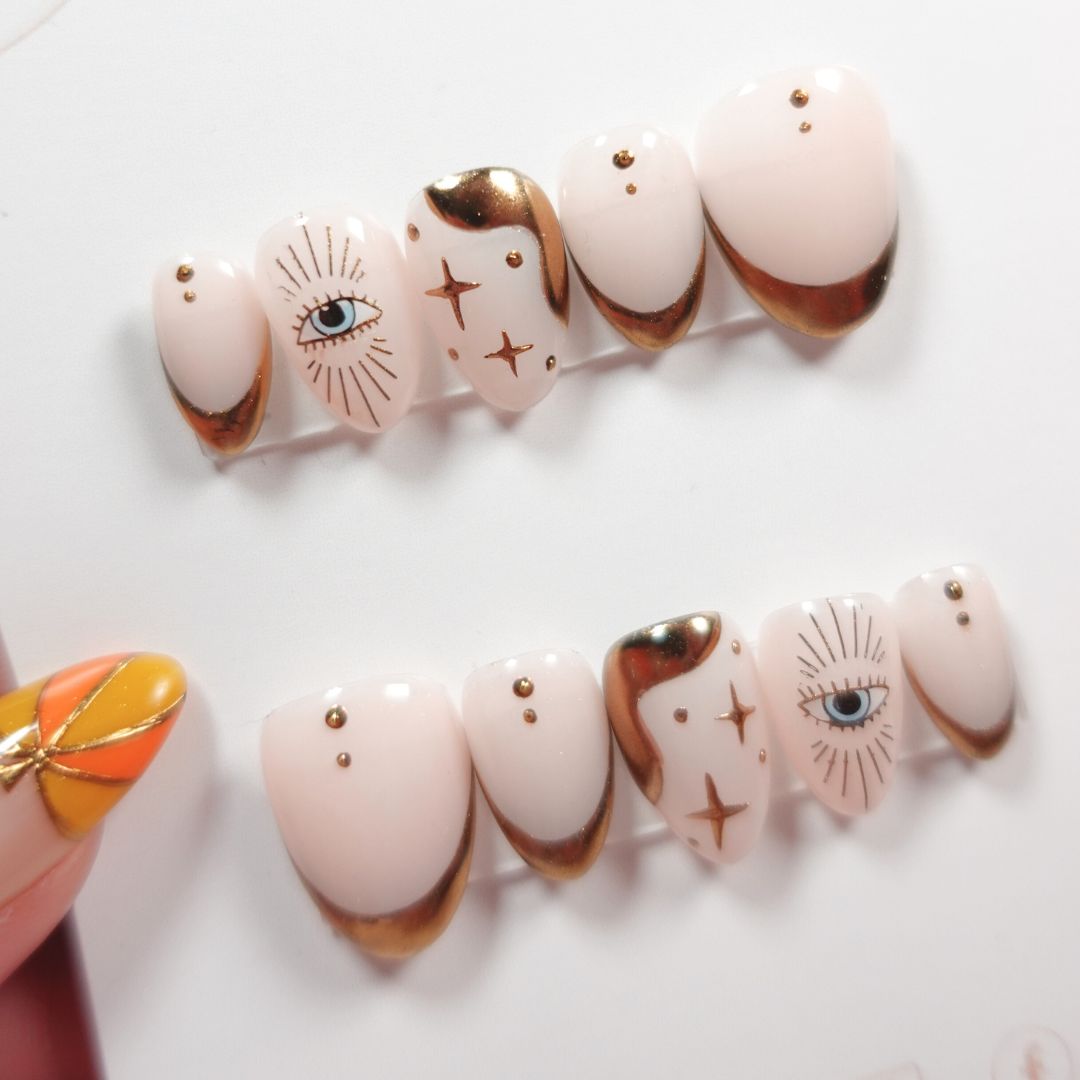 Experience the luxurious golden touch with Golden Gaze, a celestial nail set featuring a stunning gold chrome finish. Elevate your manicure game with this opulent set, perfect for adding a touch of elegance to any look.