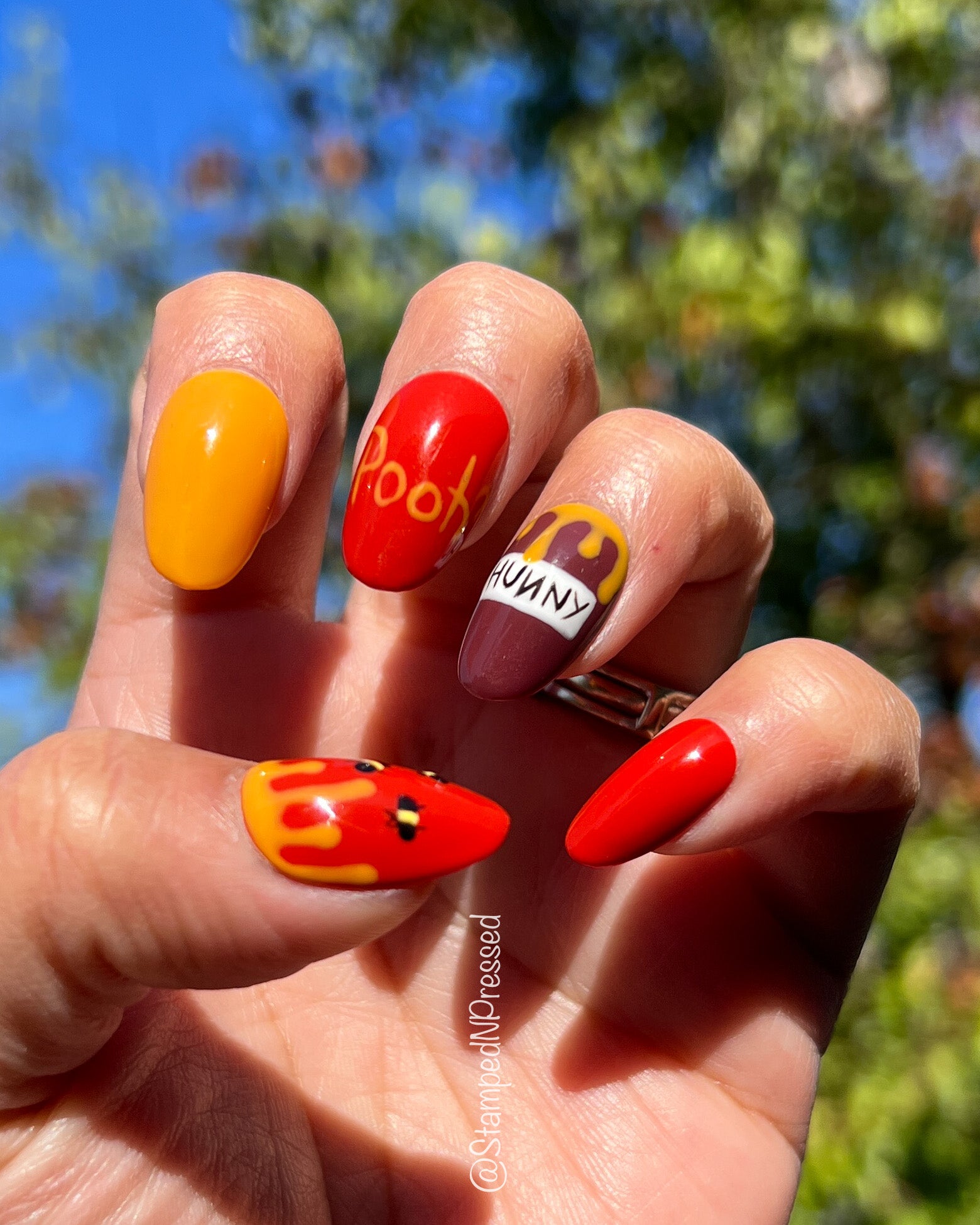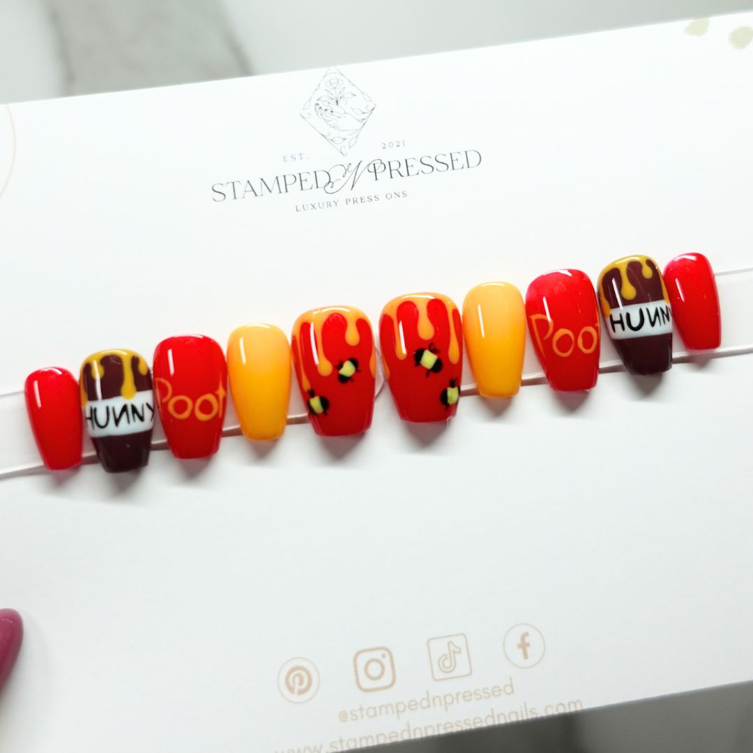 Winnie the Pooh inspired nails with honey and some little bees.
