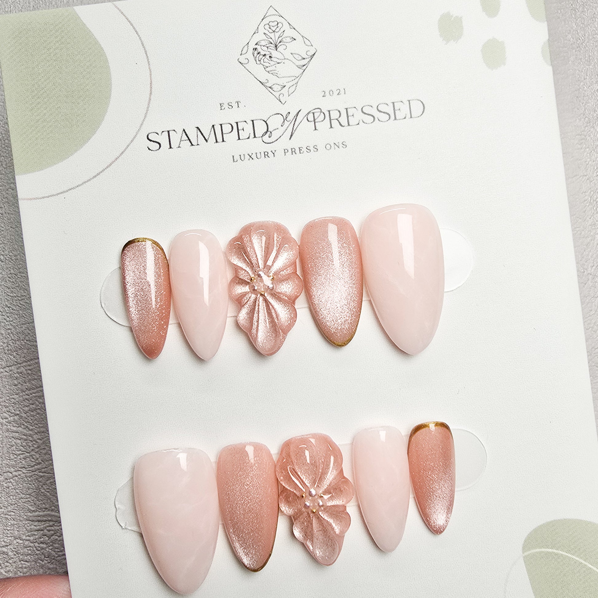Rose quartz accent nails with a pink cay eye design, thin gold line, and a 3D flower