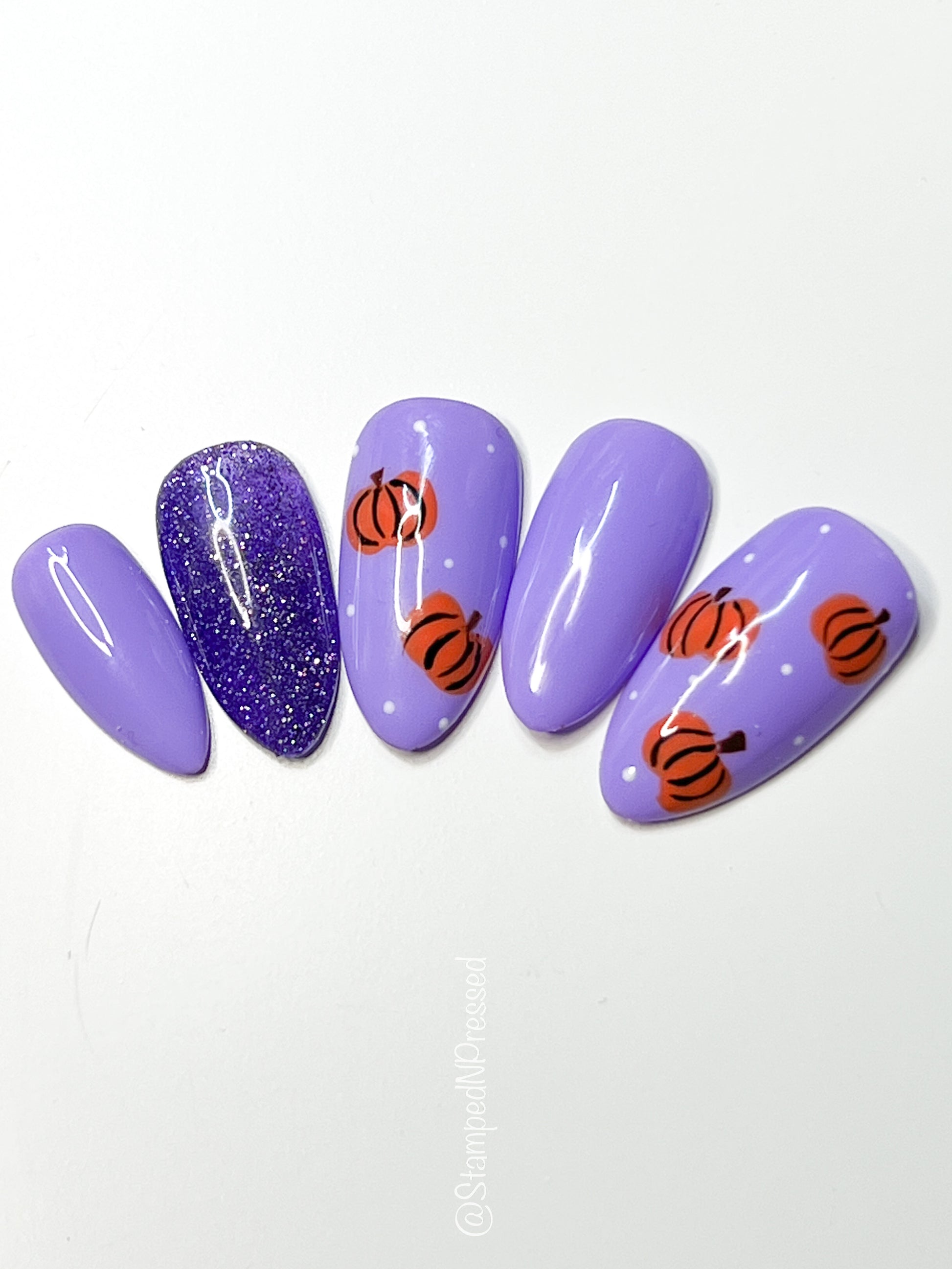 Purple nails with purple reflective polish with hand drawn pumpkins.
