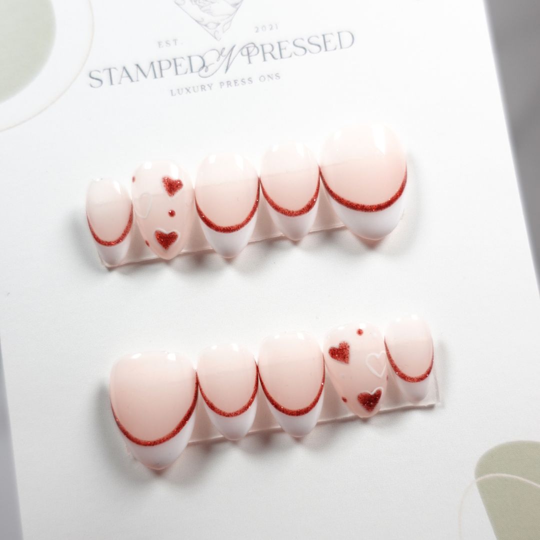 The Queen of Hearts nail design features a sophisticated french tip with charming red hearts. Perfect for adding a touch of romance to any look.