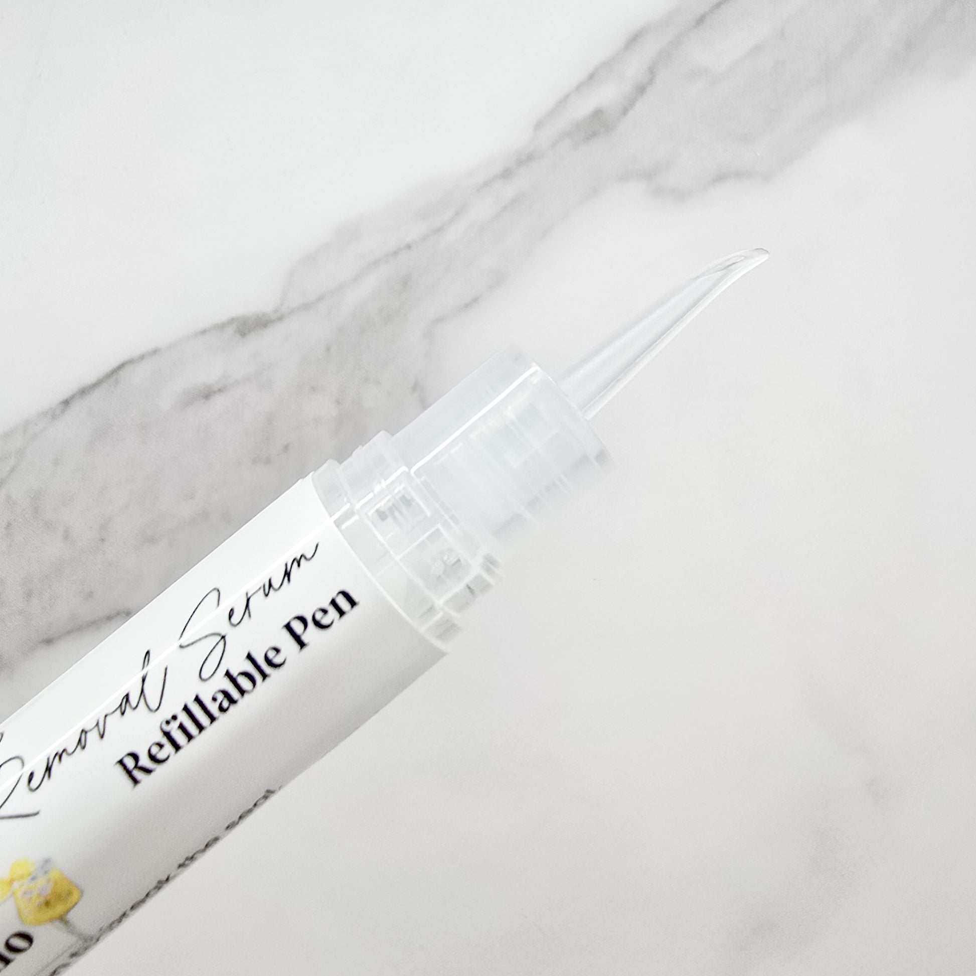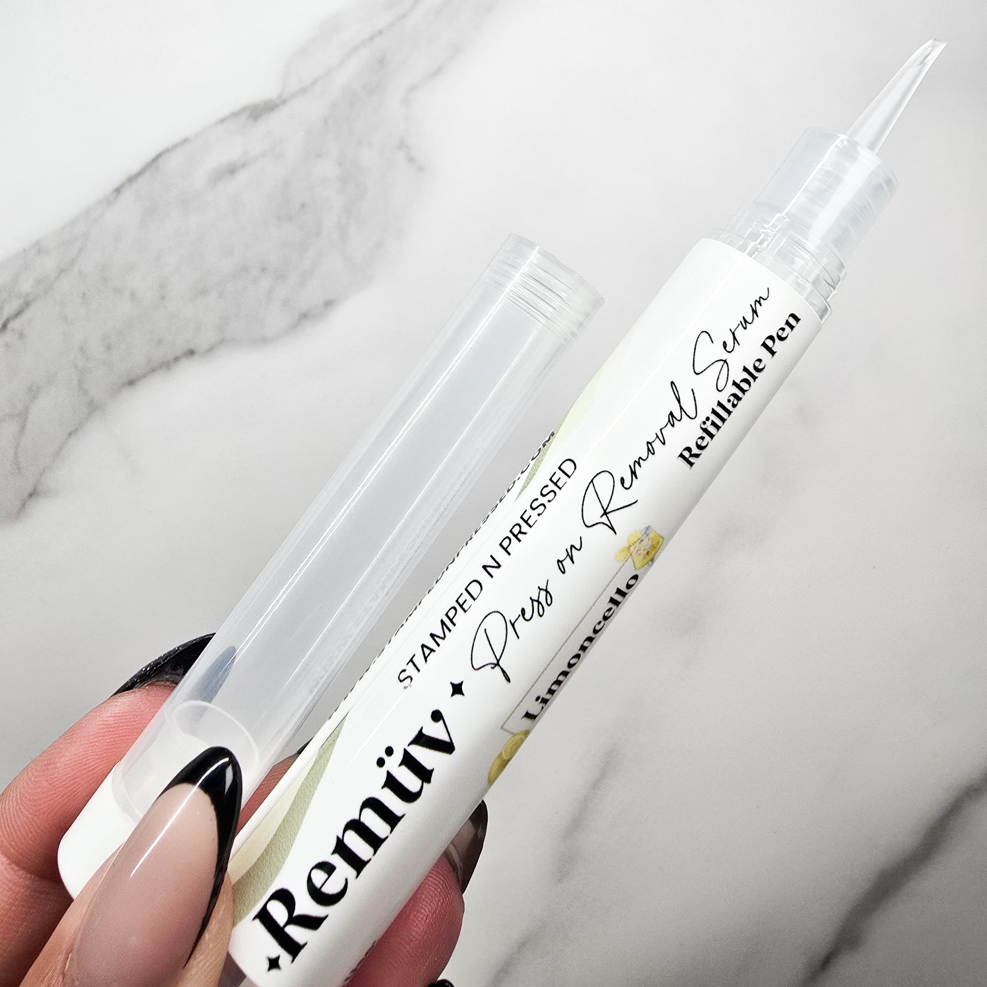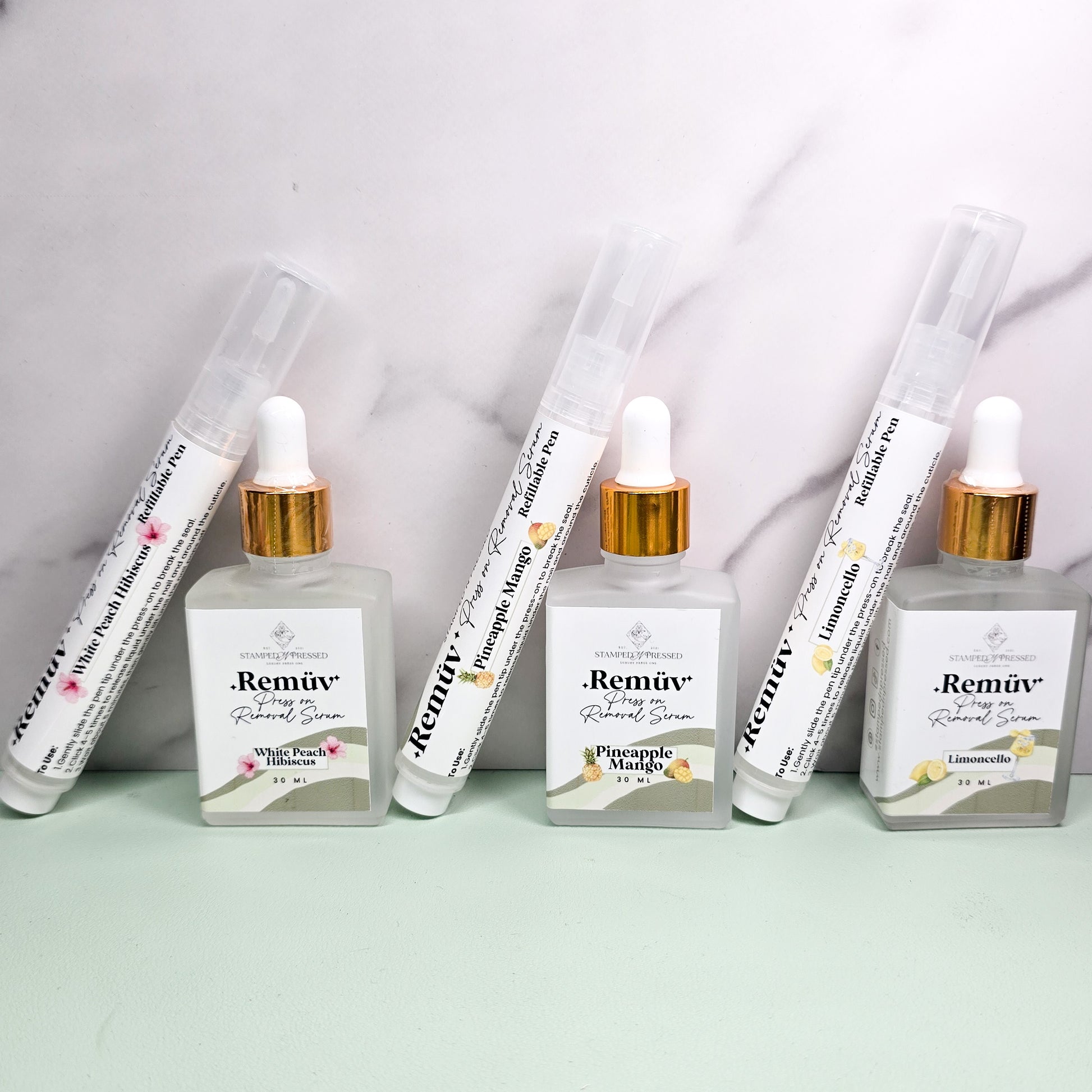 Remüv is a serum used for removing Stamped N Pressed press-on nails with ease. This bundle includes the refillable pen, equipped with a fine pointed tip for precise application of the serum between your natural nail and the press-on, ensuring smooth, hassle-free removal. Alongside it, a 30 ml dropper bottle allows you to conveniently refill the pen, keeping your serum accessible whenever needed. Formulated without acetone, Remüv provides a gentle yet effective method for safe and comfortable nail removal.