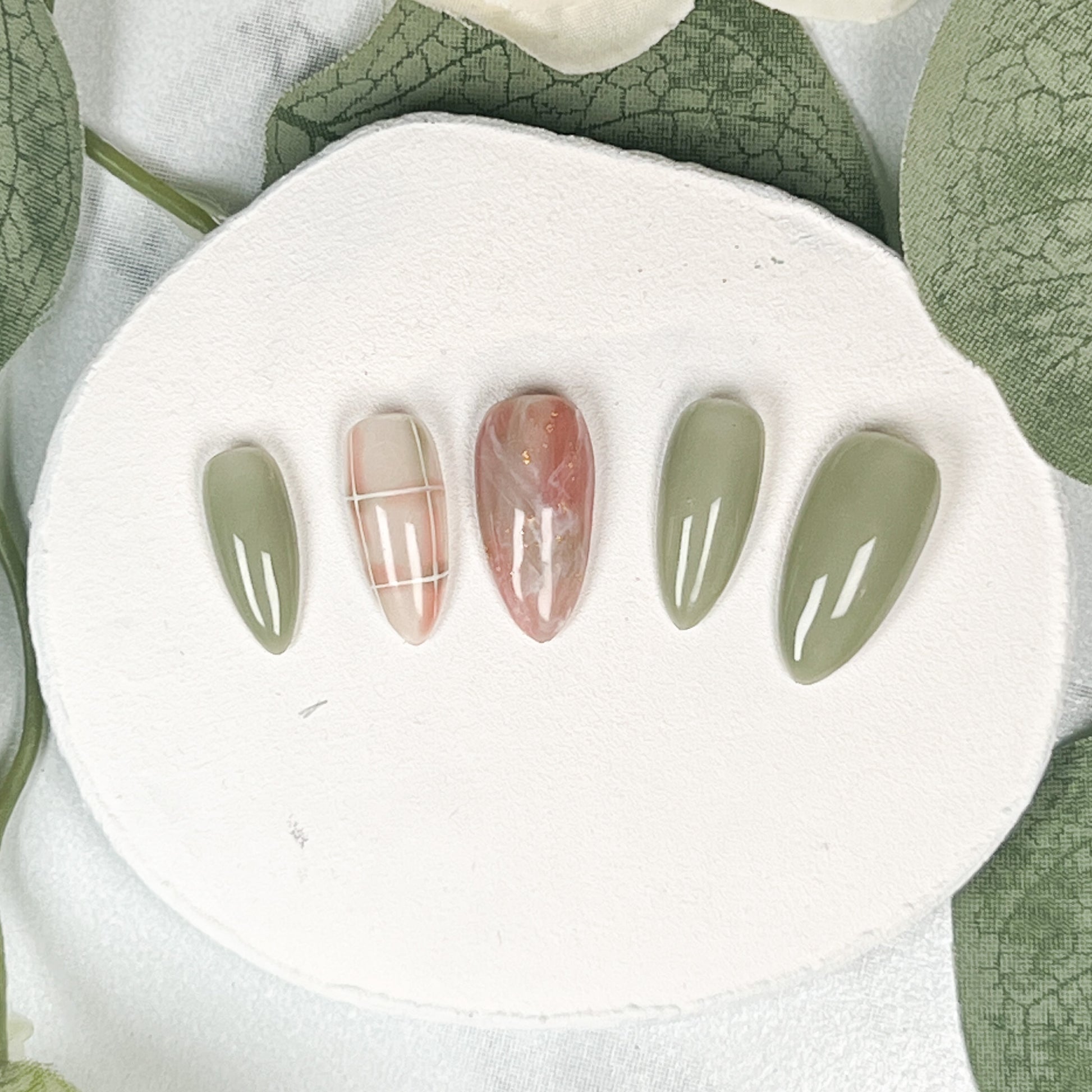 Subtle green nail set with a plaid and marble designs creating a unique look with a touch of pink accents.