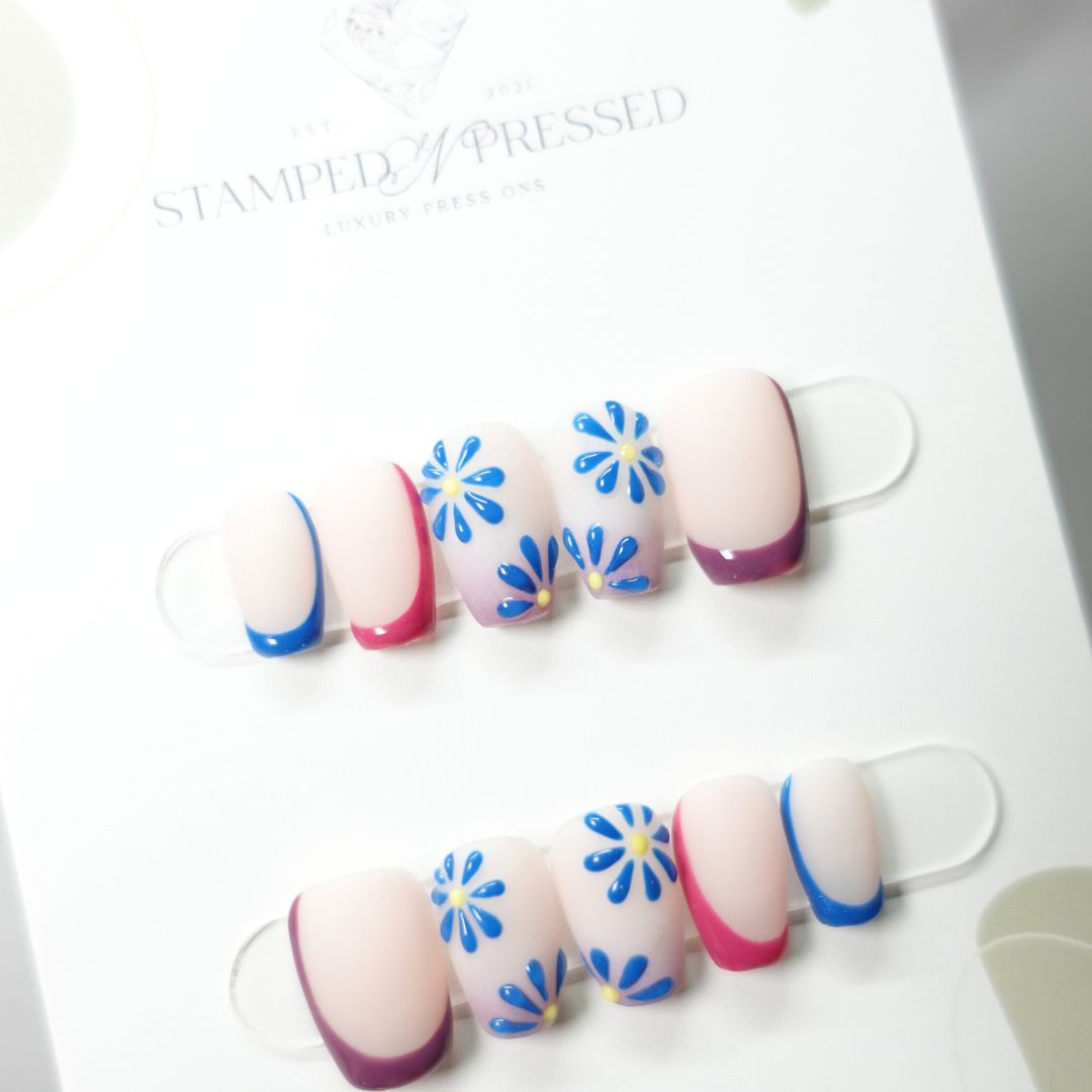 Introducing Springtime Splendor, the perfect nail set for the season. With a mix of matte and glossy finishes, and 3D flower accents. The asymmetrical french tip adds a unique twist to classic nail designs. Elevate your style with Springtime Splendor.