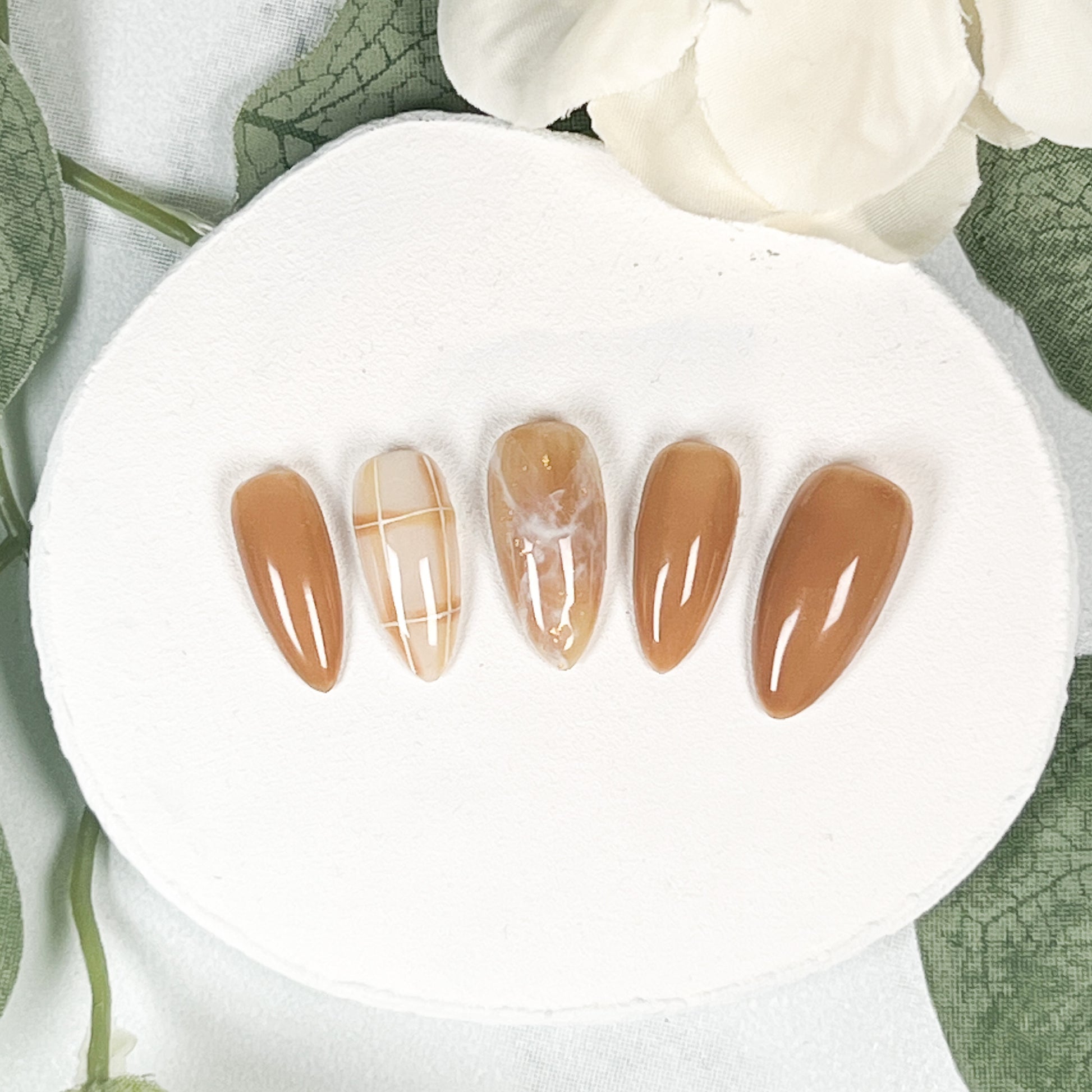 Subtle brown nail set with a plaid and marble designs creating a unique look.